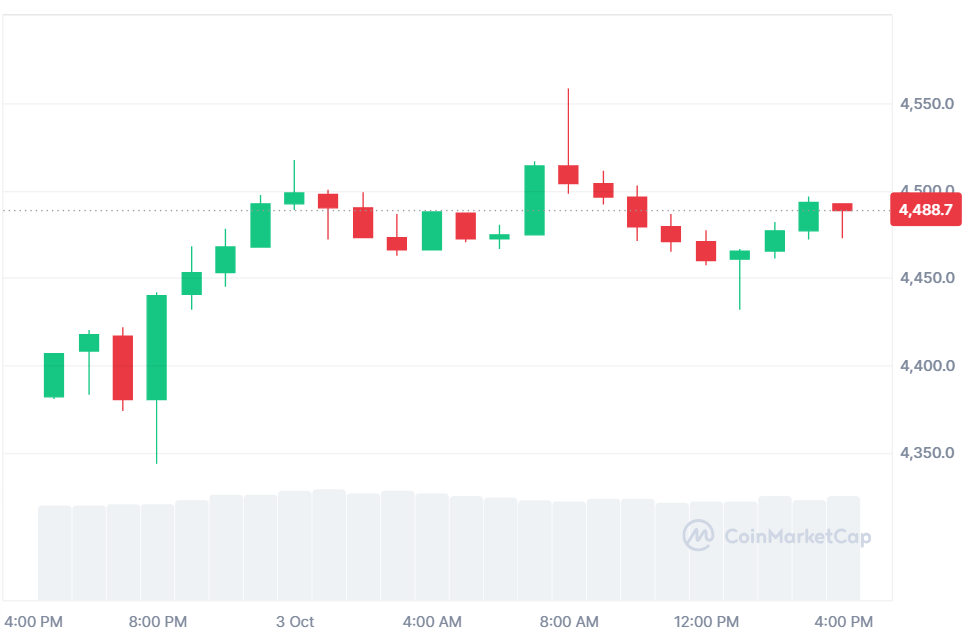 Ethereum (ETH) is currently trading at $4,488, representing a 2.17% rise in the last 24 hours. The trading volume has increased by 7.87% and is currently standing at $47.06 billion. This momentum indicates increasing interest among investors.