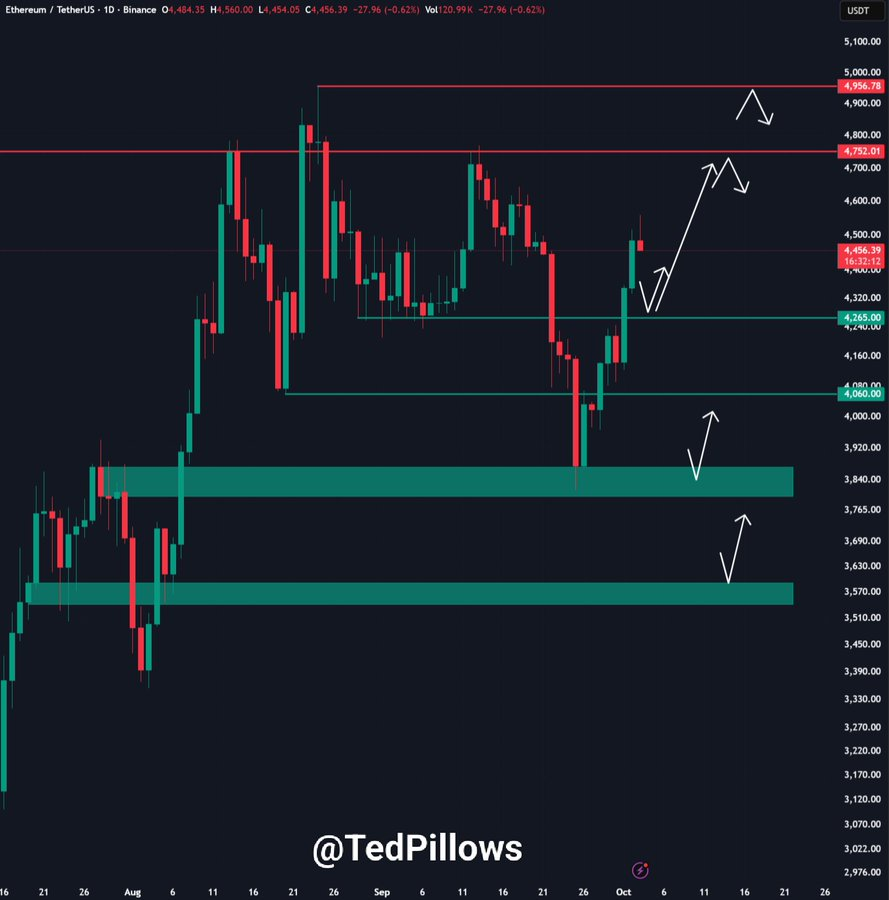 Ted Pillows, a popular analyst, highlighted that Ethereum is experiencing some resistance at around $4,500. He reckons that in case Ethereum is able to make it past this mark, the price can even escalate to $4,700 and $4,750.