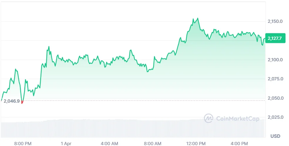At the time of writing, the Ethereum price is trading at $2,129, up 3.52% in the last 24 hours, according to CoinMarketCap data. The trading volume increased by 21.1%, reaching $21.39 billion. Over the last seven days, Ethereum is down by 2.45%.