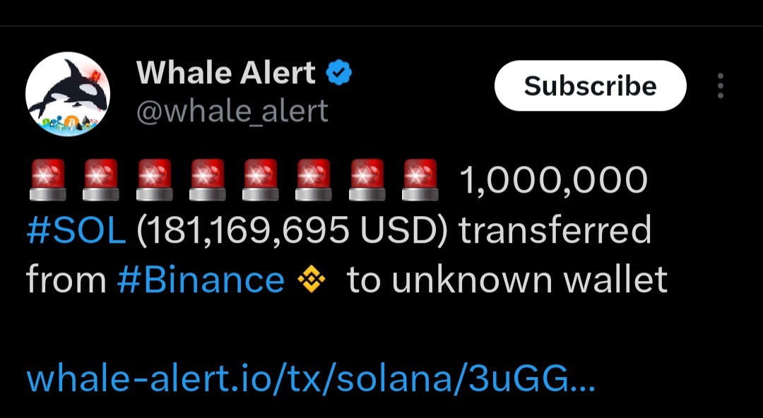 Whales_alert reported that 1 million SOL tokens worth over $181 million were transferred from Binance to an unknown wallet.