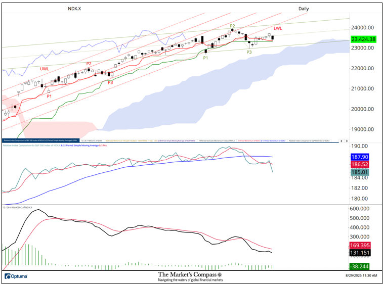 In my Substack Blog post published a week ago, last Wednesday, I stated that there were several technical factors, as the title suggested, that there was potential “Early Signs of a Crack in the Back of the Nasdaq 100 Index’s Rally”. My only concern at that time was that I was sticking my neck out with that warning, considering that over the remainer of the week there was a few potential news events that could invoke volatility in the rates market that would likely overflow into the equity markets. That proved to be a reasonable concern, and my technical thesis was promptly “Jackson Holed” last Friday and investors were caught “wrong sided” and equities, including the NDX Index rallied sharply. In doing so it retook the ground back above the broken Kijun Plot (green line) There was a measure follow through over the rest of the week until today. That five-day rally from a week ago last Wednesday’s low could not even begin to challenge the Lower Warning Line (red dashed line) of the longer-term Standard Pitchfork (red P1 through P3).
