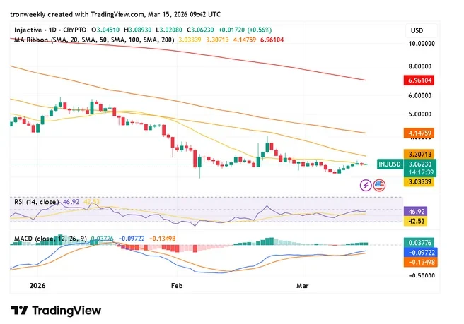 At the time of writing, INJ is trading at $3.06, with a 24-hour trading volume of $40.02 million and a market capitalization of $306.32 million. INJ is recording a 1.33% gain over the last 24 hours, according to data from CoinMarketCap.