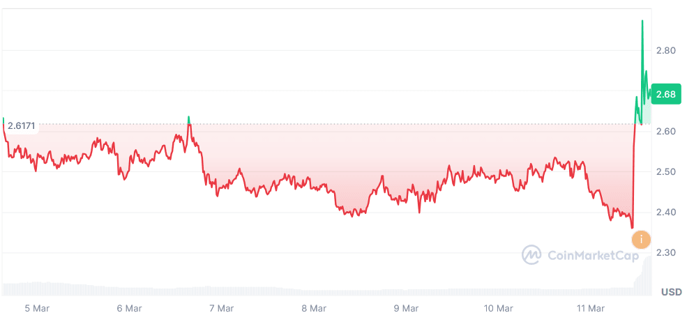 A strong bullish candle pushed the price near $2.68, signaling renewed buying pressure. This move suggests improving sentiment and a possible short-term trend stabilization.