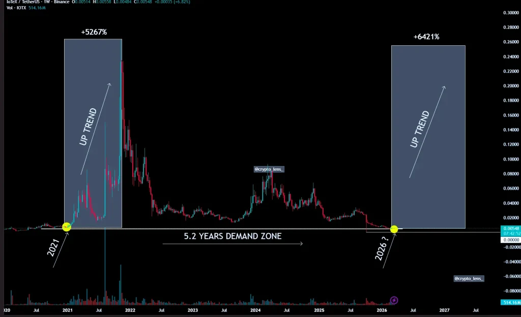 Price has now returned to a critical demand zone near $0.005, where strong historical buying previously triggered a breakout toward $0.02, $0.06, $0.10, and $0.25 levels.