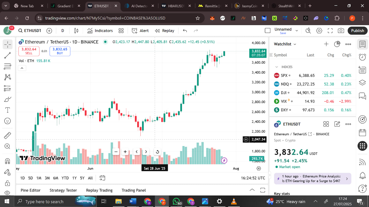 Ethereum price action was a sign of a significant technical recovery as the coin surged past the stubborn resistance of the $3,800 mark that had stagnated price action over weeks. As the Ethereum news are making headlines once again, traders are keeping a tab on whether Ethereum will be able to hit the next milestone of $4,000 in the upcoming sessions or not.