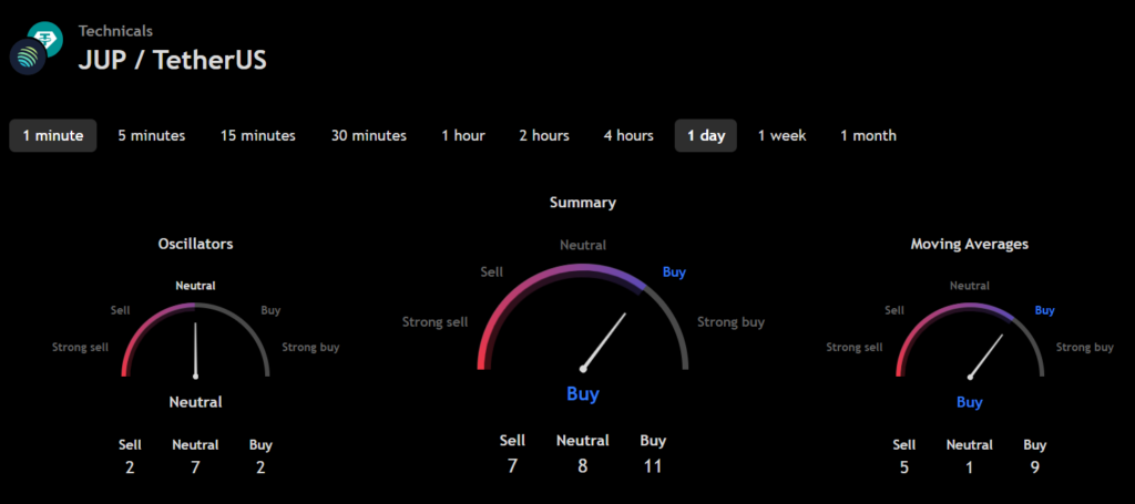 The technical analysis indicators, such as Relative Volume (RVOL), Moving Average (MA), and Relative Strength Index (RSI) of Jupiter (JUP), are shown in the chart below.