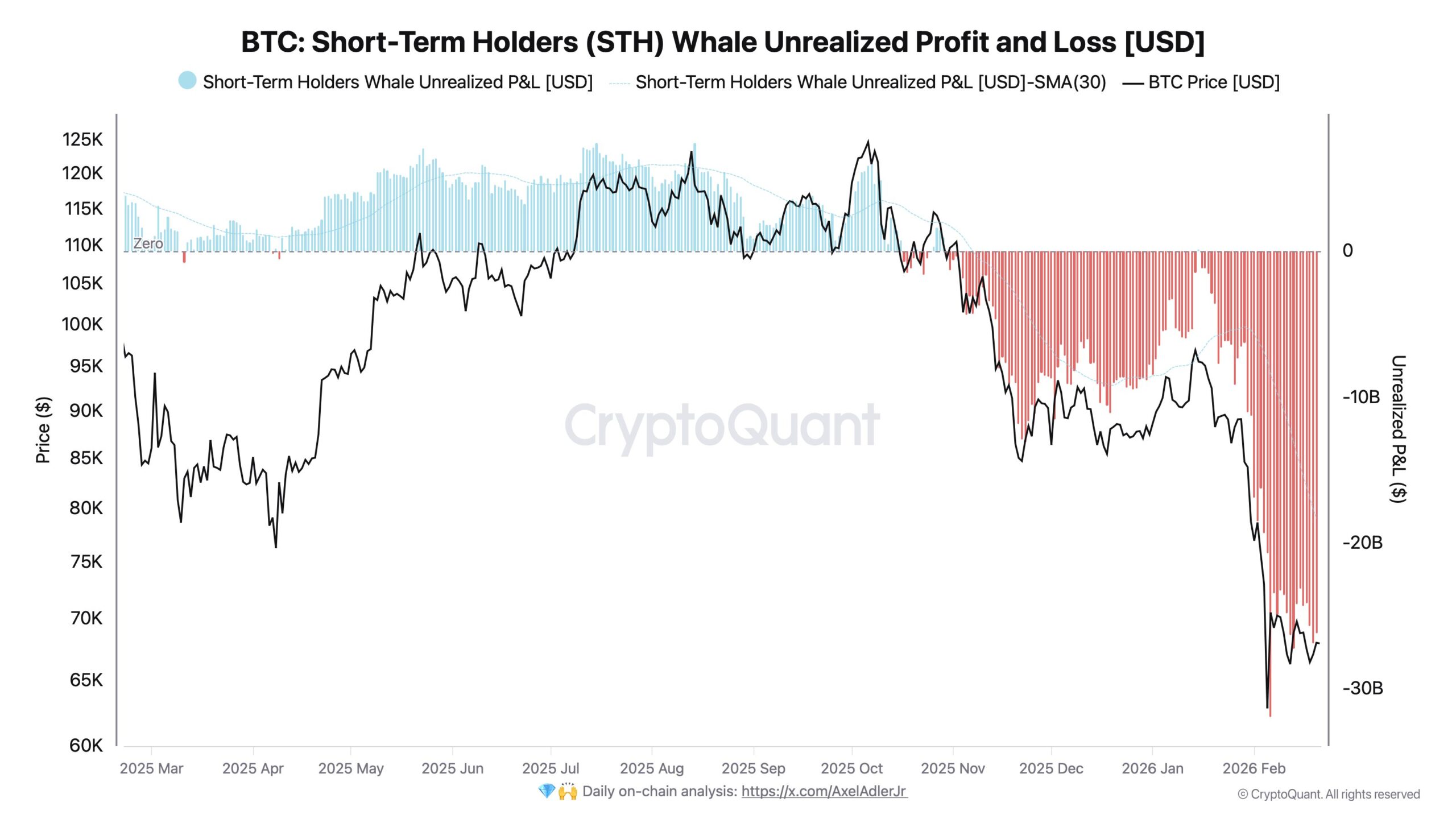 On-chain data reveals additional fragility beneath the surface. Unrealized losses held by short-term holder (STH) whales – wallets that accumulated Bitcoin within the past six months – have climbed to roughly $26 billion.