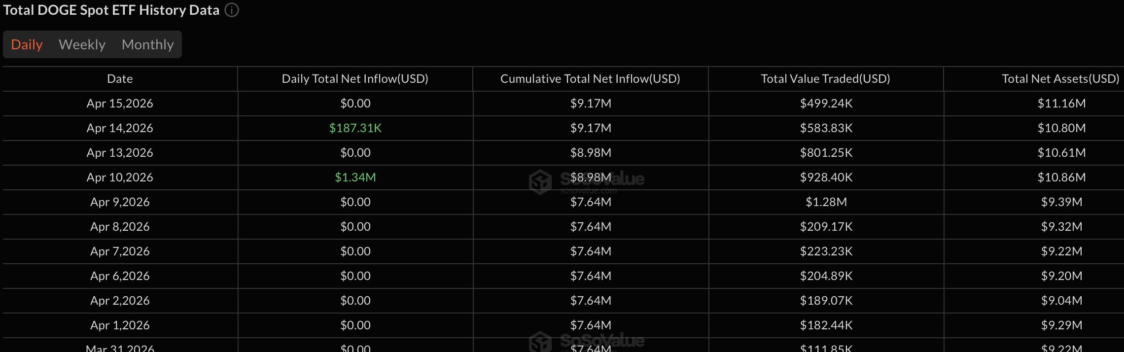 It is worth noting that Dogecoin spot ETFs do exist, with cumulative net inflows reaching $9.17M. However, daily flows have been largely at zero for most of the recent period, with only sporadic inflows, $1.34M on April 10 and $187K on April 14 being the exceptions. Total net assets stand at $11.16M according to SoSoValue data, which remains very modest. Until ETF flows show consistent and sustained inflows, they cannot be relied upon as a meaningful driver of upside momentum. For now, the ETF exists on paper, but institutional appetite remains largely absent.