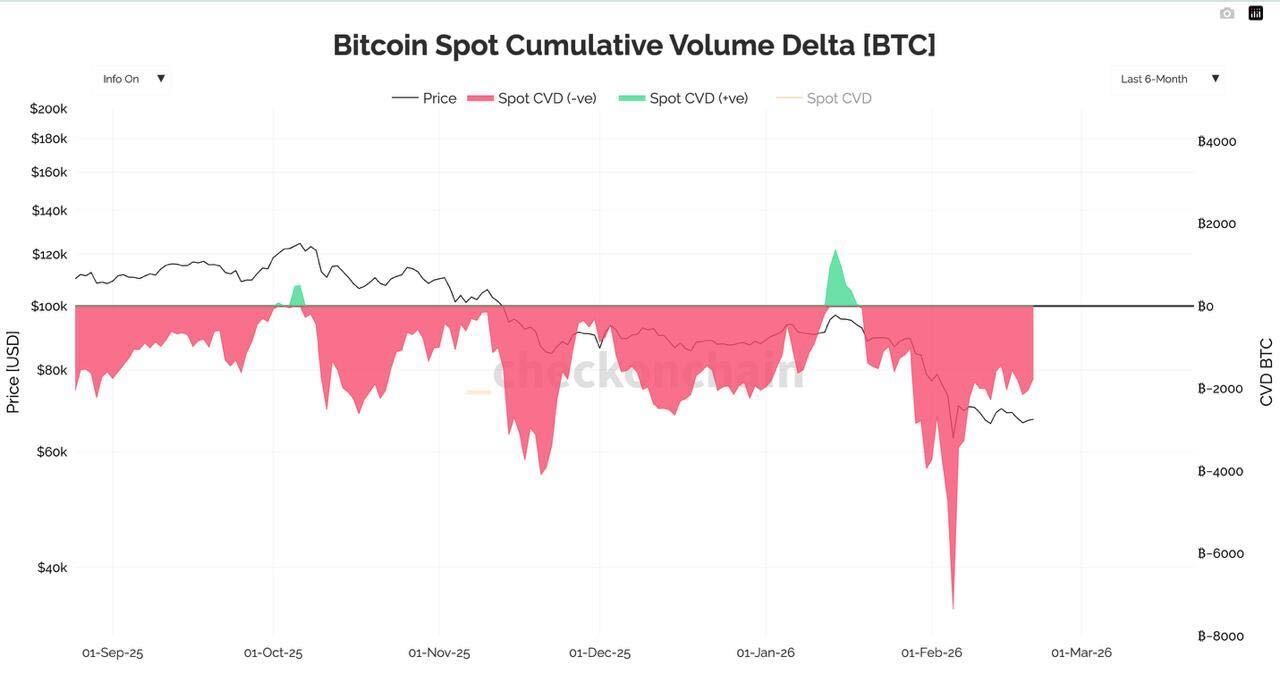 Cumulative Volume Delta data suggests roughly 2.5 billion dollars in net market sells since February 20 across centralized exchanges. This reflects broad distribution rather than isolated liquidation events. Historically, breakouts tend to fail when sustained net selling pressure persists.