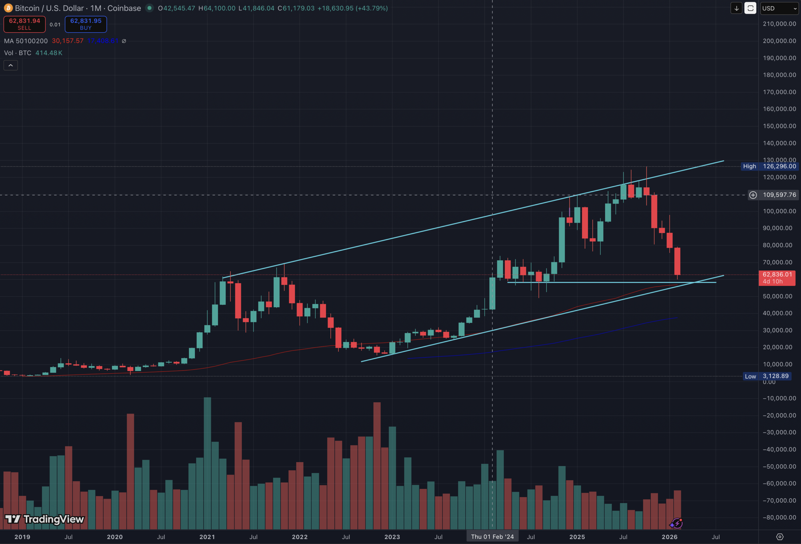 On the monthly timeframe, several key technical factors align in the 55K-58K region. Most notably, the MA50 sits directly within that range, historically acting as a broad-cycle support that “covers all” during deeper retracements.