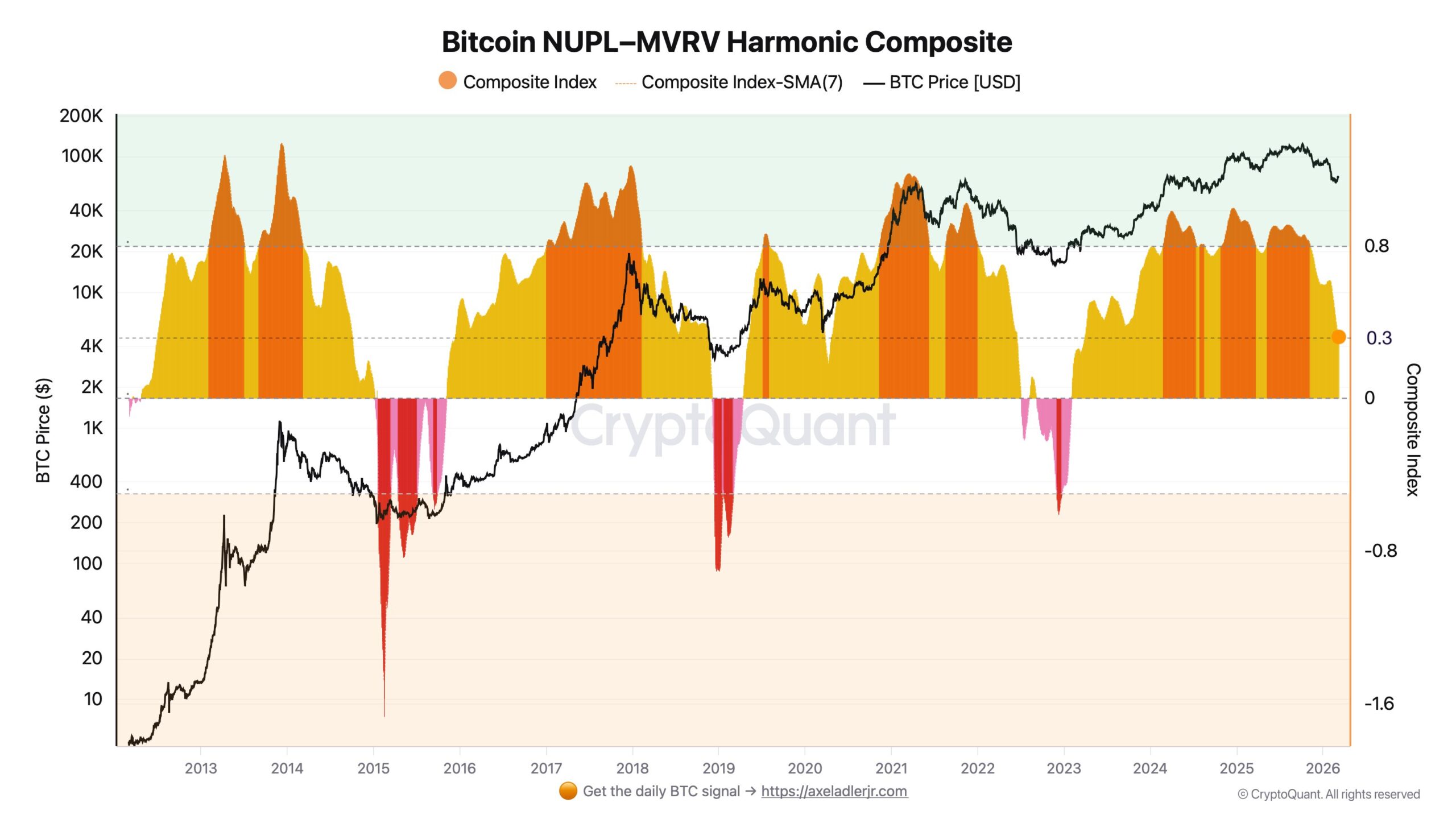 That view is partially supported by separate data from on-chain analyst Axel Adler Jr., who pointed to the Bitcoin NUPL-MVRV Harmonic Composite — a blended metric combining two sentiment and valuation indicators. NUPL, or Net Unrealized Profit/Loss, measures whether the average holder is sitting on gains or losses. MVRV, the Market Value to Realized Value ratio, compares Bitcoin’s current market cap to the aggregate cost basis of all coins in circulation. Together, they provide a picture of how stretched — or how beaten down — market participants actually are. The composite currently reads 0.33. In past cycles, capitulation bottoms formed when the metric dropped to around -0.5.