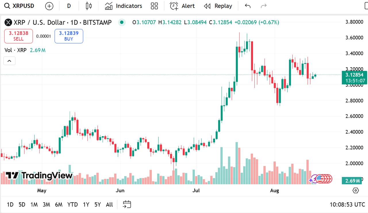 XRP, however, has been moving in the opposite direction. The token’s price is $3.12, down 2.74%, and it also has a huge market cap of $185.56 billion. Trading has slowed, though, with volume decreasing to $3.78 billion, declining 41.43%.