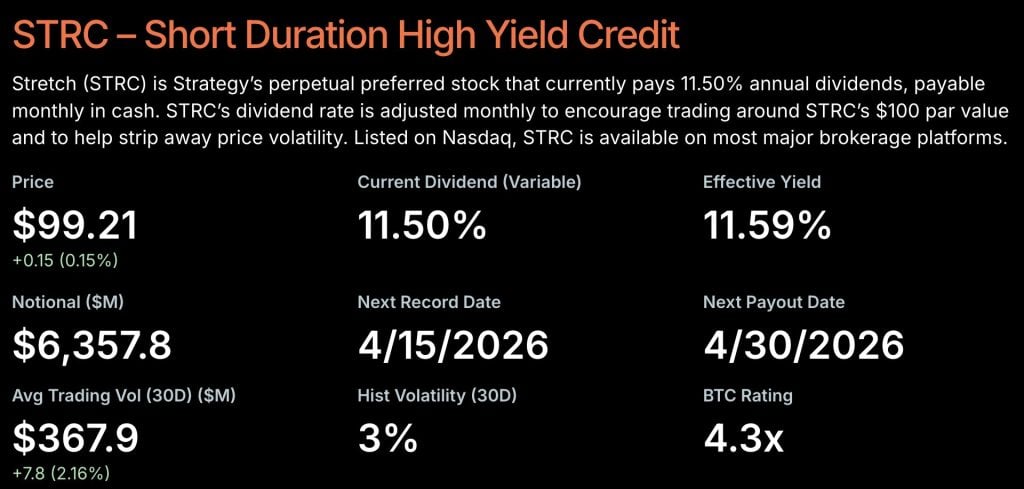 The STRC preferred series – branded “Stretch” – launched in mid-2024 at an 11.5% annualized yield, initially paying monthly dividends funded in part by Bitcoin treasury yields.