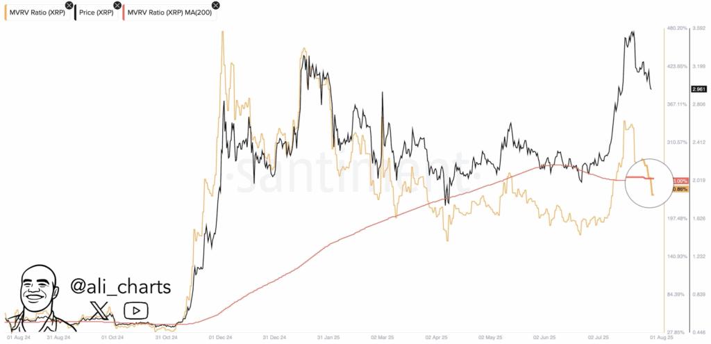 But, for popular crypto analyst, Ali Martinez, the MVRV ratio for the XRP price has flickered a death cross pattern. This move often implies that a steeper correction could be happening.
