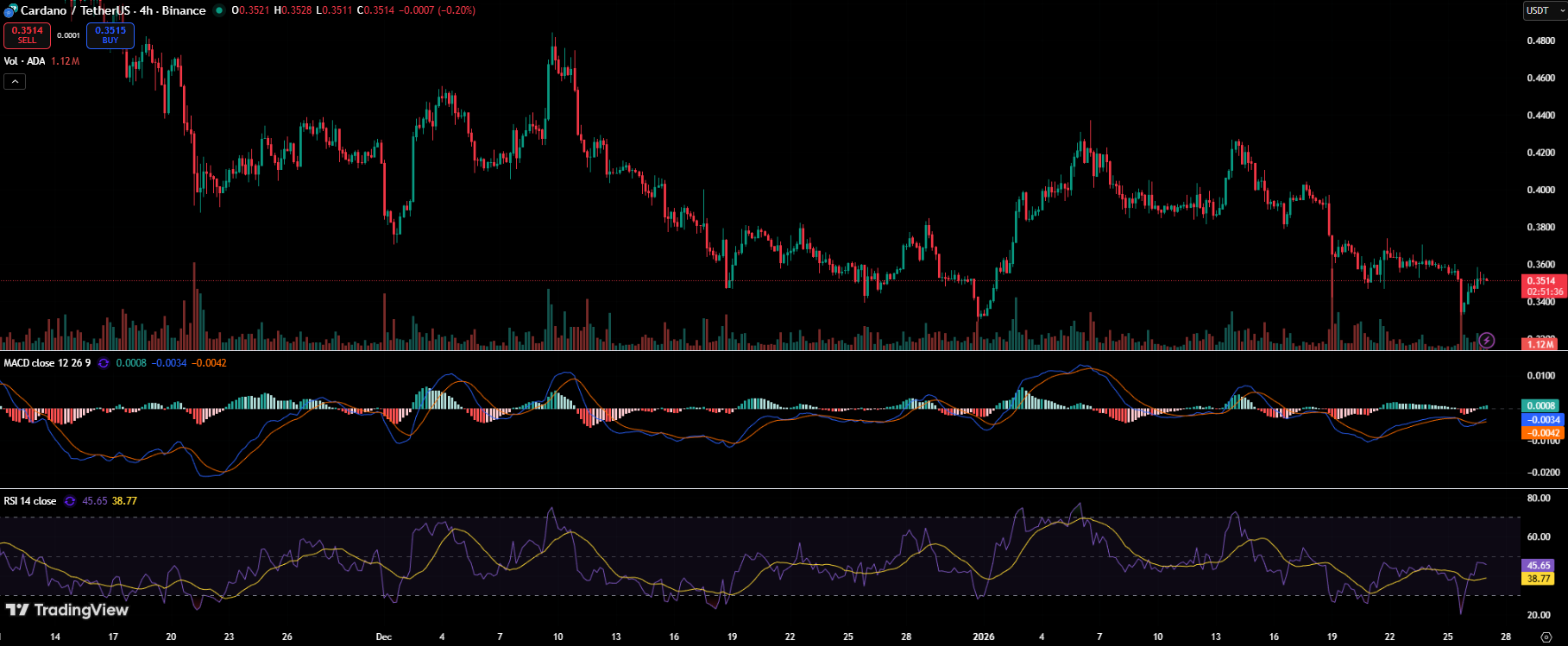 Momentum indicators reflect this uncertainty. RSI remains below neutral levels, while MACD signals show limited bullish follow-through, reinforcing the idea that ADA is still in a waiting phase.