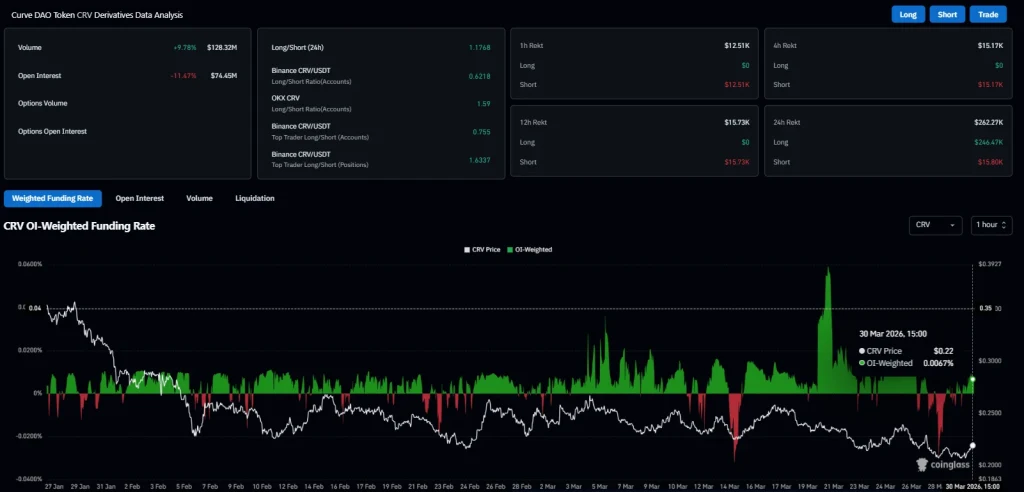 According to CoinGlass data, the future volume increased by 9.78% to $128.32 million. Meanwhile, the open interest reduced by 11.47% to $74.45 million.