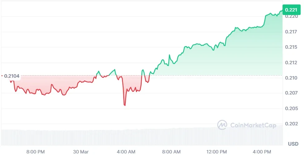 As of writing, Curve DAO Token (CRV) is trading at $0.2210, marking an increase of 5.57% in a day. The trading volume is showing a strong bullish surge up 28.27% and is currently standing at $46.81 million. Over the last week, the token has decreased by 0.91%, according to CoinMarketCap.
