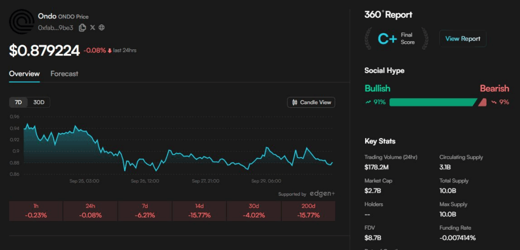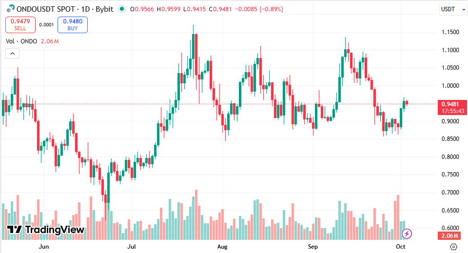 Ondo Finance (ONDO) is showing signs of resilience in the market today, currently priced at $0.9480 with a 24-hour trading volume of $354.14 million. Its market capitalization now at $3.01 billion has translated 0.07% market dominance for the project. Token has risen 0.43% over the past 24 hours.