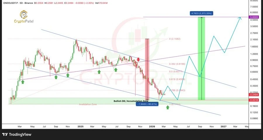 Moreover, another analyst, Crypto Patel, mentioned the broader technical structure. He noted that ONDO had entered a high-timeframe Fibonacci demand area ranging from $0.26 to $0.18. This area has confluence with a bullish order block and Wyckoff accumulation structure located at a point of support.