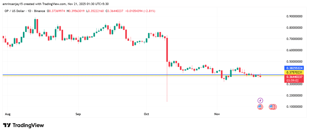 As per Coincodex data, over the next five days, OP will reach the highest price of $ 0.3899 on November 21, 2025, which would represent 8.47% growth compared to the current price.