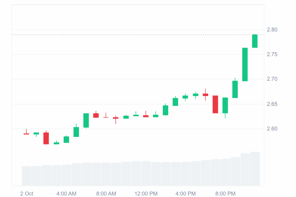 At the time of writing, CAKE is trading at $2.79 with a market capitalization of $961.1 billion. Its price surged by 8.09% over the last 24 hours and 6.88% over the last week. Its trading volume increased 72.29% to $93.59 million.