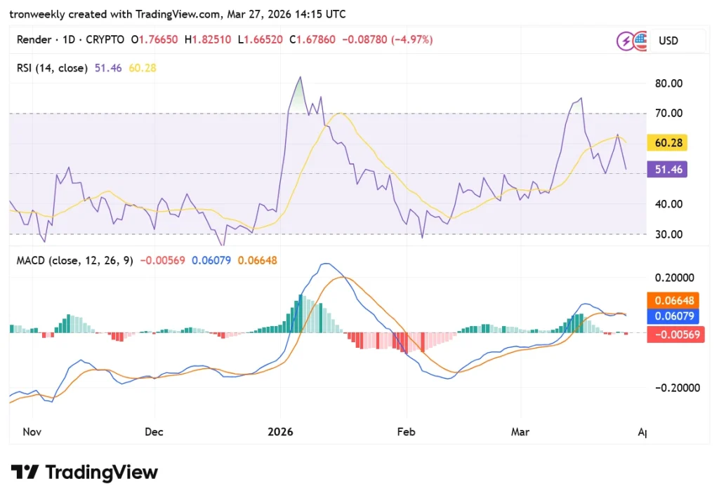At the time of writing, Render trades near $1.66, marking a continued downtrend from recent highs. The token’s market capitalization stands at $869.74 million, as per the CoinMarketCap data.