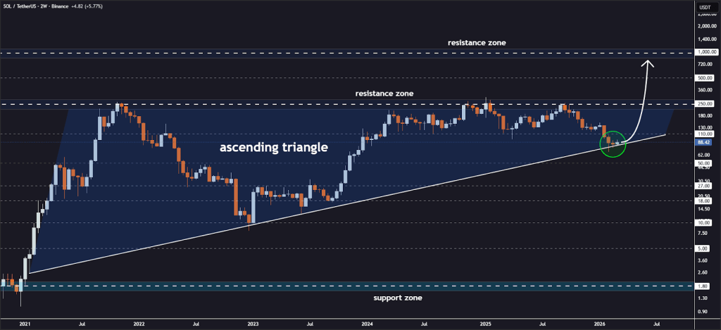 Solana appears to be gaining strength after a rebound from the lower boundary of a long-term ascending triangle formation on the 2-week chart.