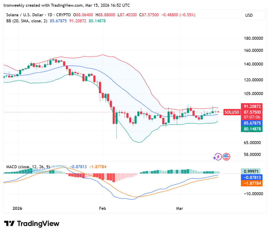 Currently, the asset is trading at $87.57, with the candles compressing around the 20-day SMA, indicating a high volatility squeeze is underway.