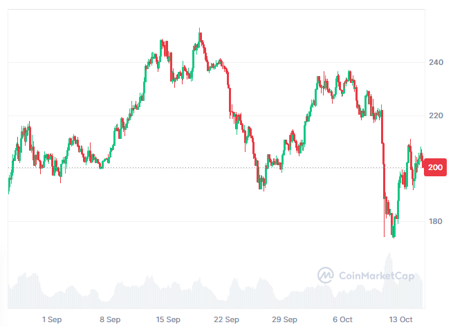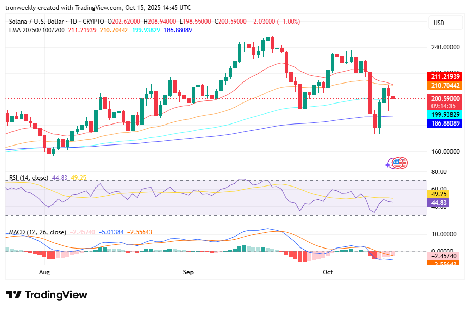 At the time of writing, SOL is trading at $201.87, supported by a market capitalization of $110.36 billion. Moreover, its trading volume decreased 21.34% to $10.73 billion, revealing hesitation among investors before re-entering the market.