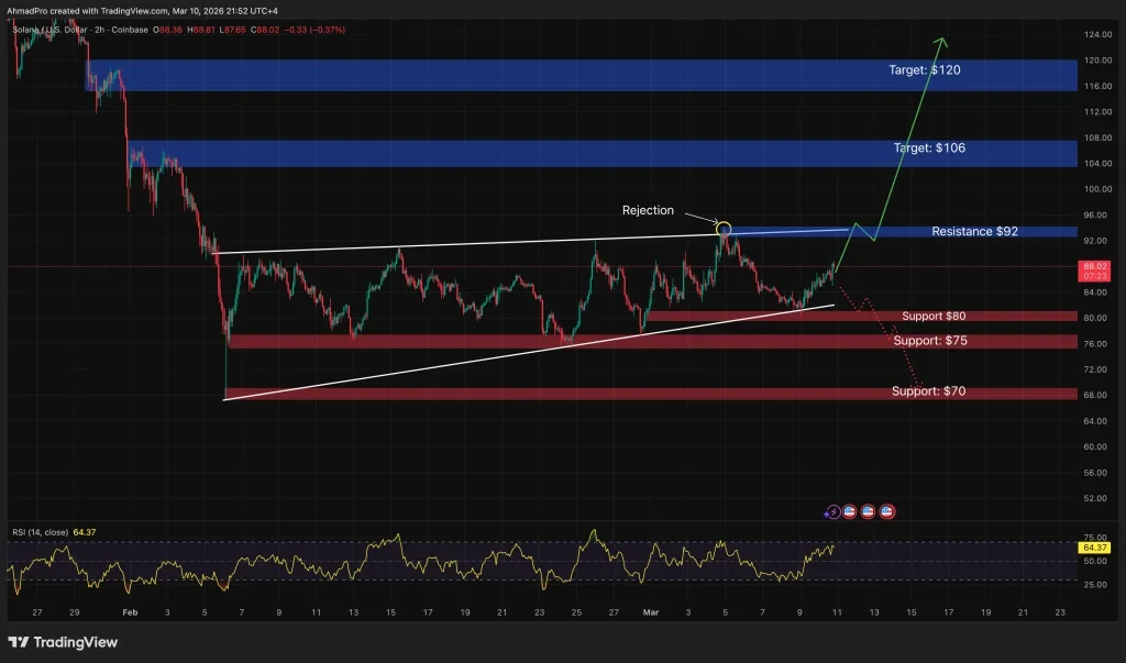 Recent price action shows that SOL remains under pressure despite strong activity across its ecosystem. From technical data, it is clear that Solana traded around the $88 level in recent hours but is still in a technical pattern that is not clear due to recent losses this year.