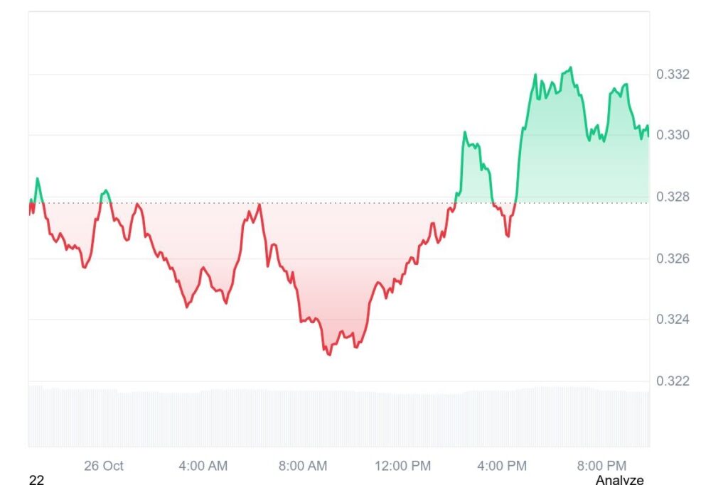 Meanwhile, Changelly’s projections remain more conservative, estimating an average trading range between $0.358 and $0.376, with a potential ROI of 13.2%. For October 2025, analysts anticipate a modest fluctuation between $0.329 and $0.338, implying a near-term ROI of 1.8%.