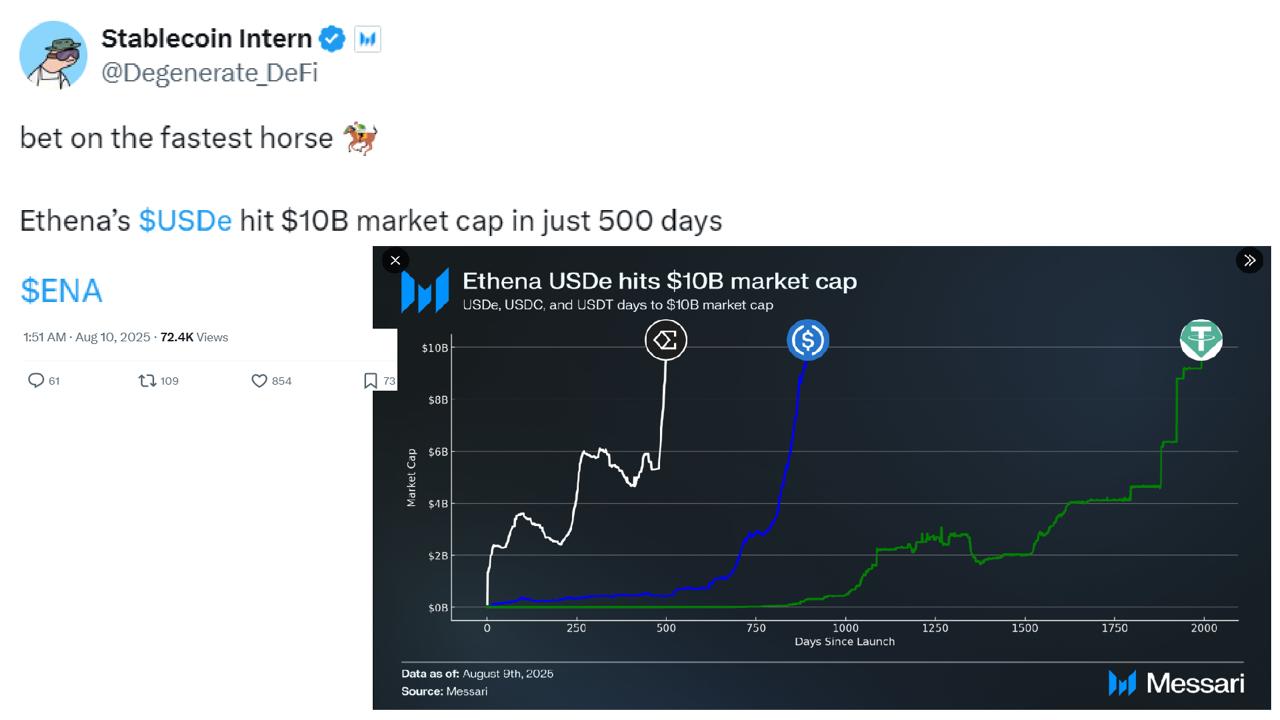An X post from Stablecoin Intern (@Degenerate_DeFi) posted August 10, highlighting Ethena’s $USDe hitting $10B market cap in just 500 days