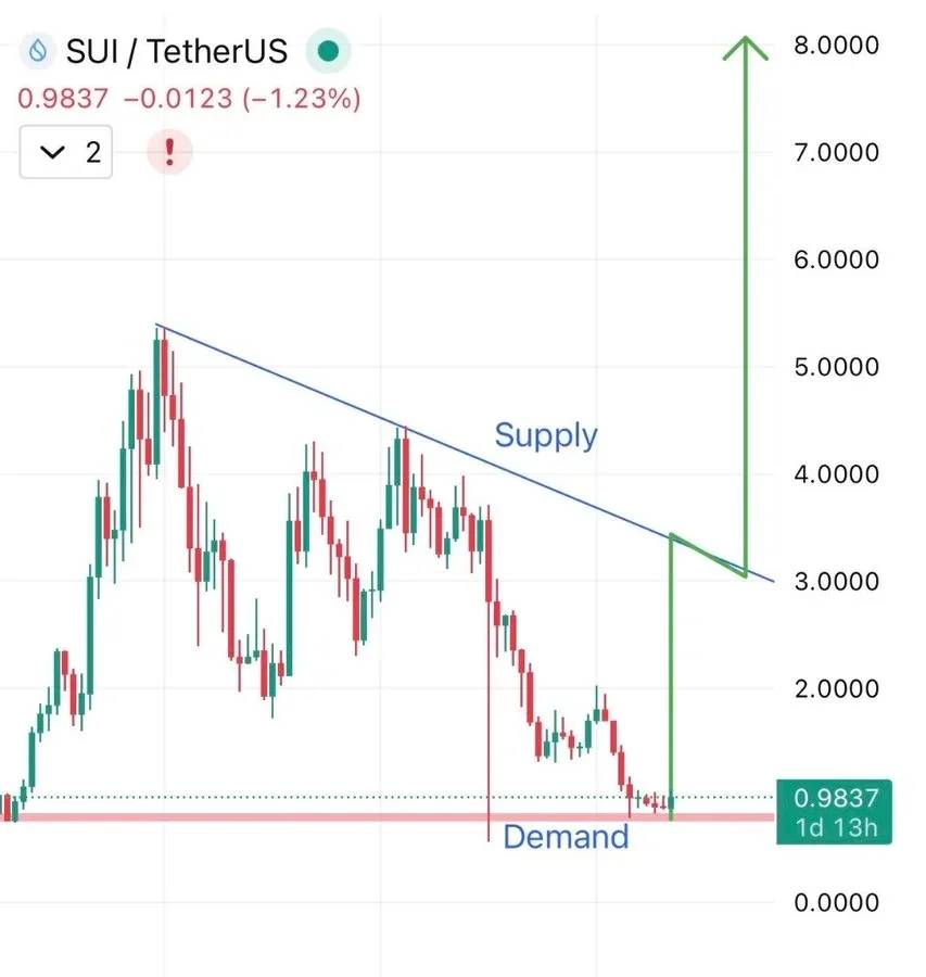 Analyst Crypto Cowboy highlights a cup-and-handle formation on SUI’s chart, signaling a potential bullish reversal. After a downtrend from the $5–$5.5 peak, SUI has returned to a strong demand zone between $0.95 and $1.00.