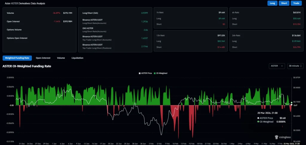 According to CoinMarketCap data, ASTER is trading at $0.6818, having declined by 0.23% in the last 24 hours. The trading volume has also gone down by 19.59% and is currently at $145.55 million. Over the last seven days, ASTER has lost 3.65%, showing that price momentum remains weak.