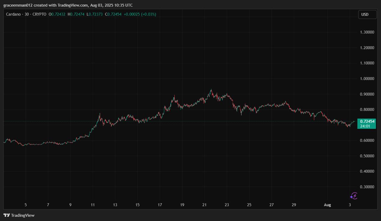 The Cardano price is trading at $0.72 showing little movement in the market. This slowdown could mean investors are losing interest or taking a breather after recent gains.
