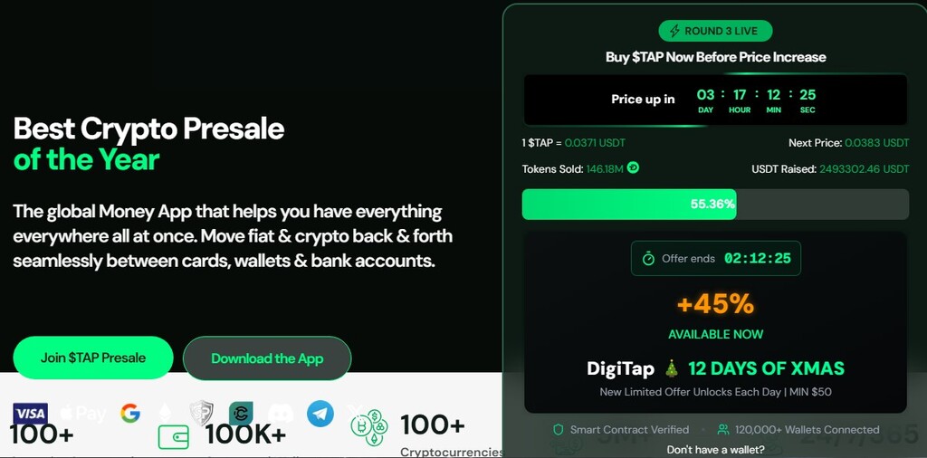 The “12 Days of Christmas” blitz, which distributes hourly rewards from bonus allocations to card perks, has ignited FOMO, with community wallets swelling 40% in a week. While BTC continues to battle waning investor confidence, which has led to a 29% year-over-year decline, $TAP’s utility protects against downturns, channeling presale momentum into sustainable growth.