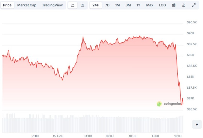 The weekend’s price action painted a stark picture of faltering momentum. On Saturday, Bitcoin traded in a tight range, peaking at $90,648 before closing marginally lower at $90,299, a negligible 0.03% dip that masked underlying fragility. Sunday brought sharper pain, as BTC cascaded from an opening of $90,296 to a low of $87,635, marking a 2.32% erosion that amplified weekend losses to over 2.7%.
