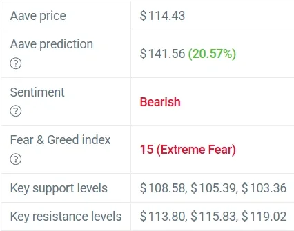The decentralized finance market is observing Aave because price forecasts predict a significant short-term price movement. The token has reached a trading value of $114.43 after it experienced a 4.30% price increase during the past 24 hours. Through that time frame AAVE outperformed the sector because the broader crypto market increased by 4.26%.