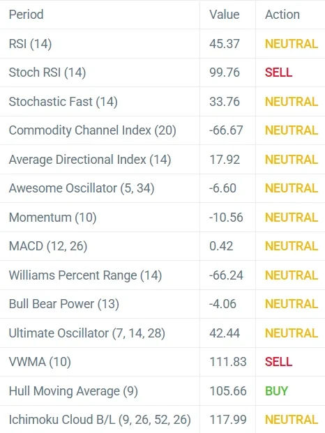 The token presents two different market indicators which create a conflict. Traders will monitor support levels at $108.58, $105.39, and $103.36 while they anticipate a 20% price increase which will meet resistance at $113.80, $115.83, and $119.02.