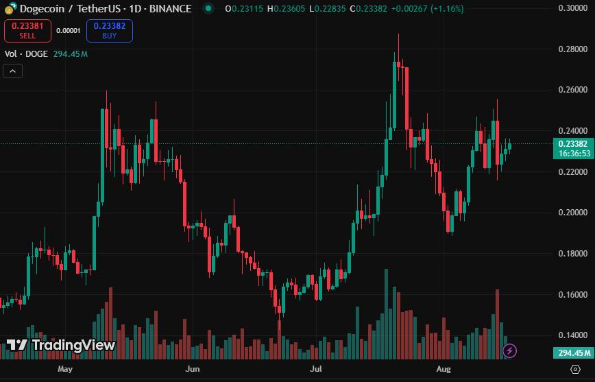 The SEC has also confirmed that all applications will be processed within a 240-day period. Dogecoin price reaction to the DOGE news of a new ETF filing has also been positive. Its price recorded a slight rally but still hovers within the $0.23 level. The surge in Dogecoin price points growing interest among traders.