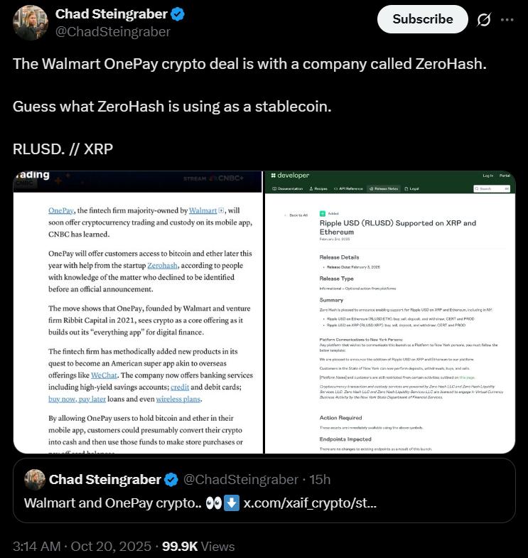 This is due to the Walmart OnePay crypto deal with ZeroHash, which uses XRP as its stablecoin. So, he believes that this deal will help XRP finally attract significant new adoption, leading to a potential price rally.