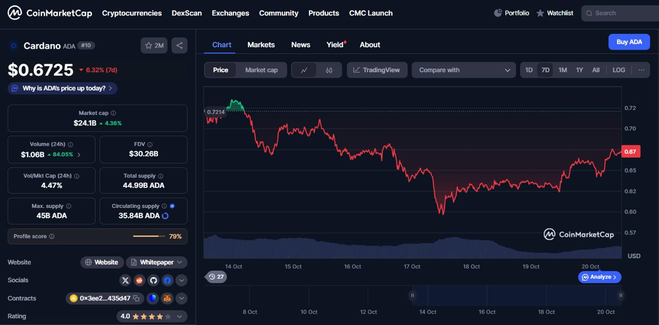 The recent market-wide downturn caused many top 10 altcoins, as well as many of what everyone saw as the “best altcoins,” to see double-digit losses. ADA is no different, and it’s currently trying to recover. Right now, the ADA price is at $0.6725, down by 6.32% in the past week.