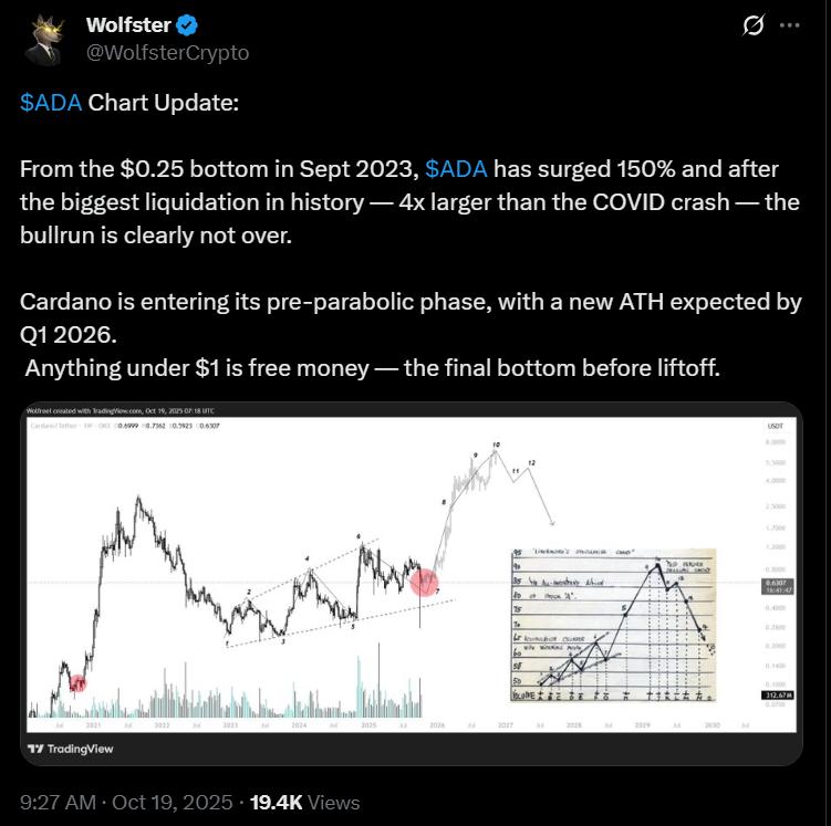 He believes that ADA is entering a pre-parabolic phase, citing the COVID crash as a comparison benchmark. According to him, ADA’s price will reach ATH in Q1 of 2026, and with that in mind, anything below $1 is cheap for this token. But of course, not many agree, as many experts say that ADA’s momentum is over, and that interest is very low.