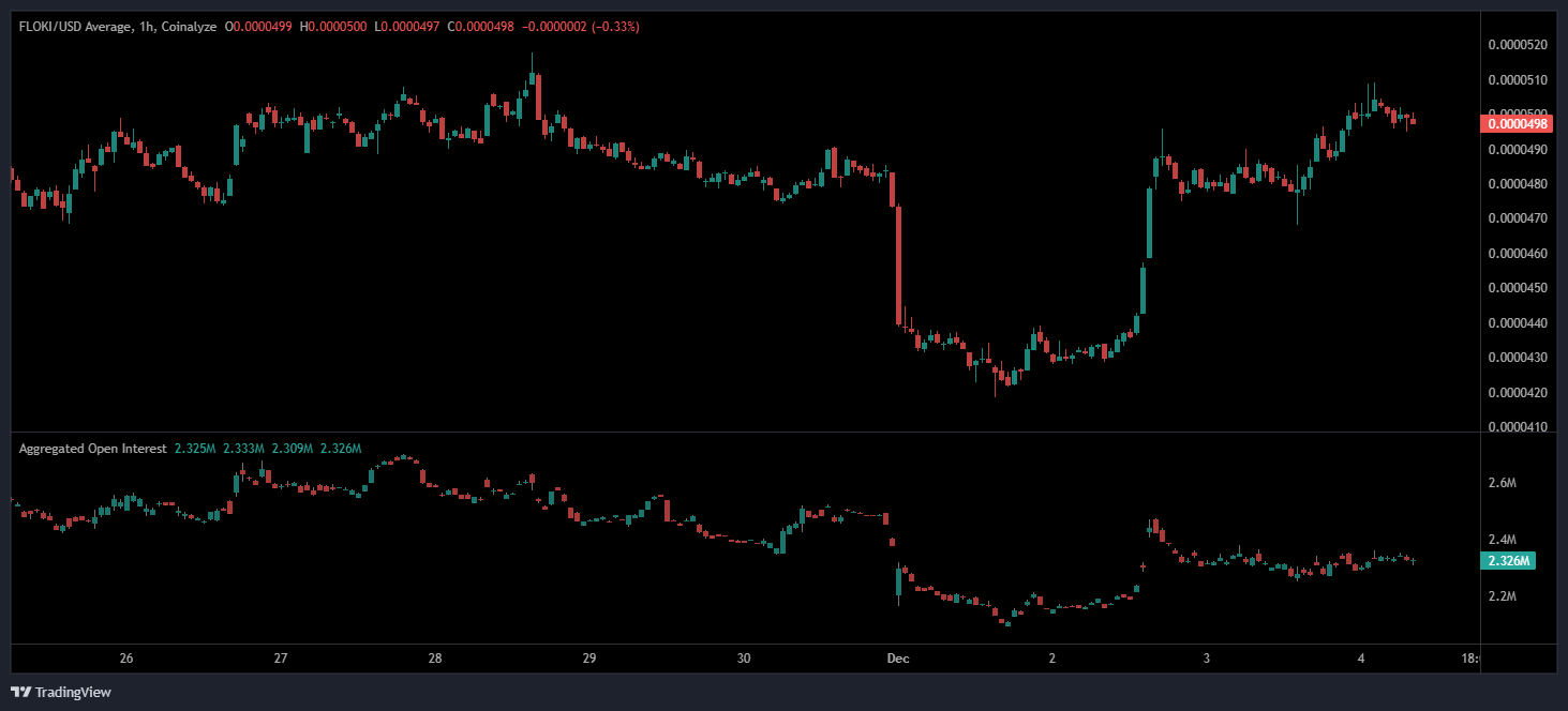 On the daily timeframe, FLOKI trades near $0.0000496, maintaining proximity to multi-month support. Candlestick structure continues to show lower highs and lower lows, reflecting broader trend softness, but recent stabilization suggests an attempt to form a local base.