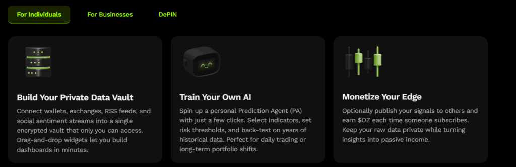 Ozak AI is intended to provide real-time predictive analytics for financial markets. It processes market data in real time using the Ozak Stream Network (OSN), and the entire system is connected to Decentralized Physical Infrastructure Networks (DePIN), which process and store information across a distributed network rather than a single server, hence strengthening security.
