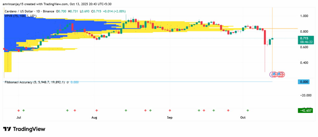 According to Cardano’s (ADA) VPVR, the altcoin is currently testing a key supply zone, where a breakout above $0.80 could create space for a trend reversal, while a failure to stay above $0.68–$0.70 could reflect new selling pressure. The highest trading volume zone (blue cluster) is between $0.70 and $0.80, indicating the majority of buying and selling that occurred there. The current price ($0.715) is located right within this high-volume area, a sign of market indecision and consolidation.
