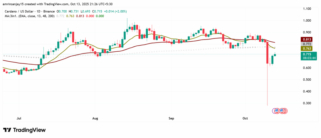 Based on ADA’s EMA 13, 48, and 200 trends, the altcoin trades below all three EMAs, confirming short-term (0.763 – Yellow line), mid-term (0.772 – Brown line), and long-term (0.813 – Red line) bearish alignment. If ADA sustains above $0.70, a short-term pullback toward $0.77–$0.81 (EMA 48–200 zone) is possible.