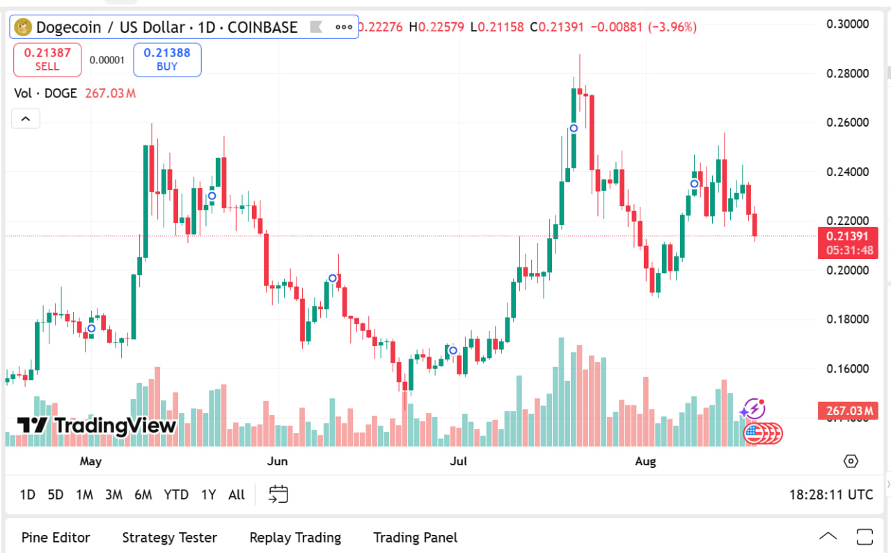 Dogecoin currently costs $0.2138, down 3.99% in the day, with a market cap of $32.19 billion. Its volume declined by 11.8%, down at $2.85 billion. Such declines are seen as indicators of investor uncertainty as speculators anticipate clearer signals of a wave structure that is bullish.