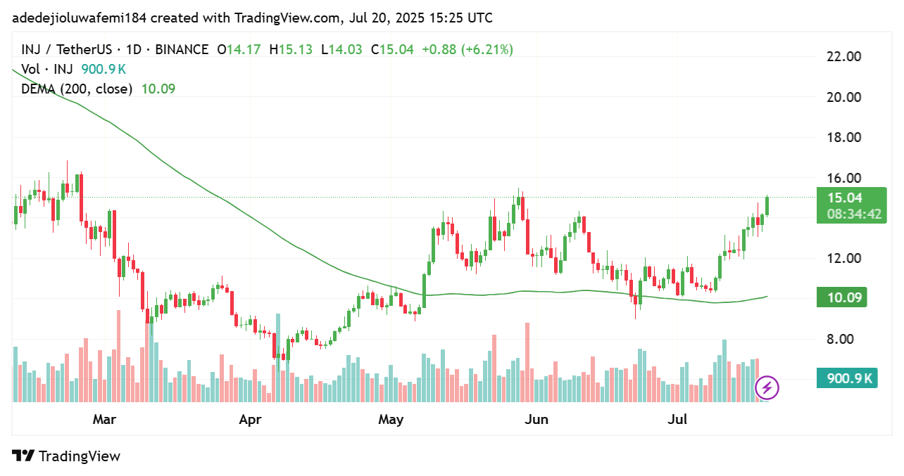 Perplexity Finance reports show a stable Injective momentum as the token holds above its 50-day and 200-day moving averages. Nonetheless, a 7x surge to $100 appears unlikely unless Injective smashes through barriers into new verticals within DeFi or secures notable exchange partnerships.