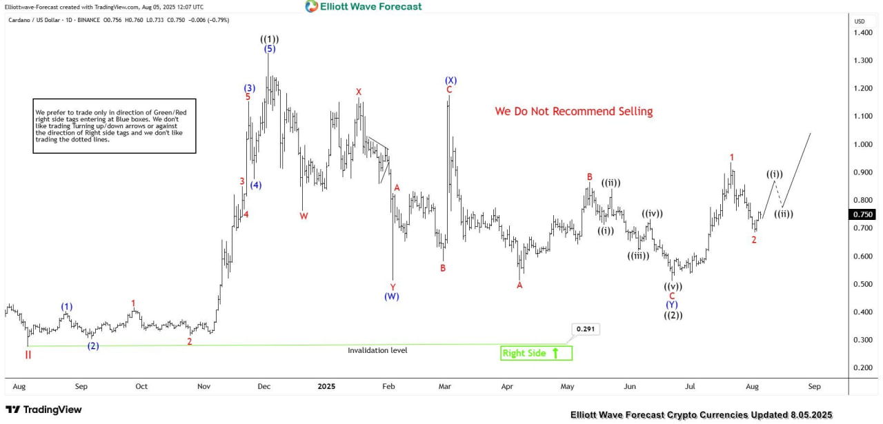 Cardano (ADA) is trading inside a bullish Elliott Wave structure within an ascending channel, pointing to the possibility of a strong rally ahead. The token is in a corrective Wave (2) phase, with analysts eyeing a potential breakout toward the next wave higher.